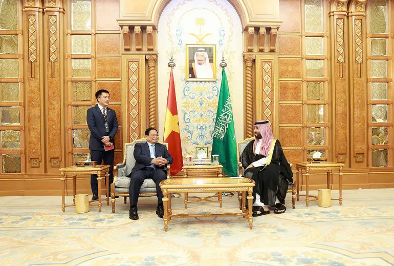 In a friendly, open and sincere atmosphere, the two Prime Ministers highly appreciated the remarkable developments in the bilateral relations between Vietnam and Saudi Arabia over the past 25 years and agreed to cooperate closely to bring the relationship to a new height. On that basis, the two leaders agreed to promote the exchange of delegations at all levels, especially high-level delegations both bilaterally and on the sidelines of multilateral forums; make economic cooperation a key pillar in the bilateral relationship, making Saudi Arabia one of the leading investors in Vietnam and aiming to increase bilateral trade turnover to over 10 billion USD by 2030; identifying the pillars of "future cooperation" of the two countries as innovation, green transformation, and digital transformation; make education, tourism, labor and people-to-people exchange a solid foundation for the relationship between the two countries and continue to closely coordinate and support each other on regional and world issues at international forums, especially at the United Nations, to limit risks, enhance dialogue and cooperation for peace and development in the region and the world.