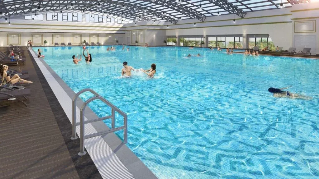 Bể bơi được thiết kế với hệ thống điều chỉnh nhiệt độ hiện đại, mang lại trải nghiệm thoải mái trong mọi điều kiện thời tiết:
